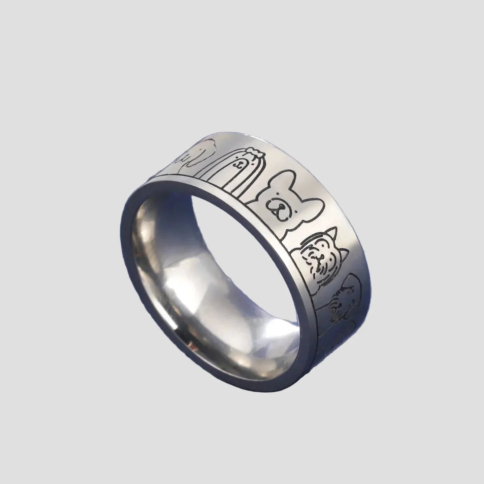 Elegantiškas, tvirtas ir kupinas asmenybės, šis nerūdijančio plieno žiedas su išgraviruotais šunų motyvais yra puikus būdas parodyti savo meilę gyvūnams.