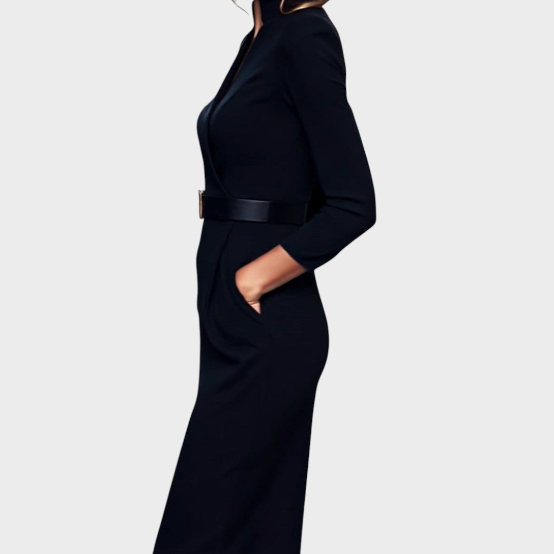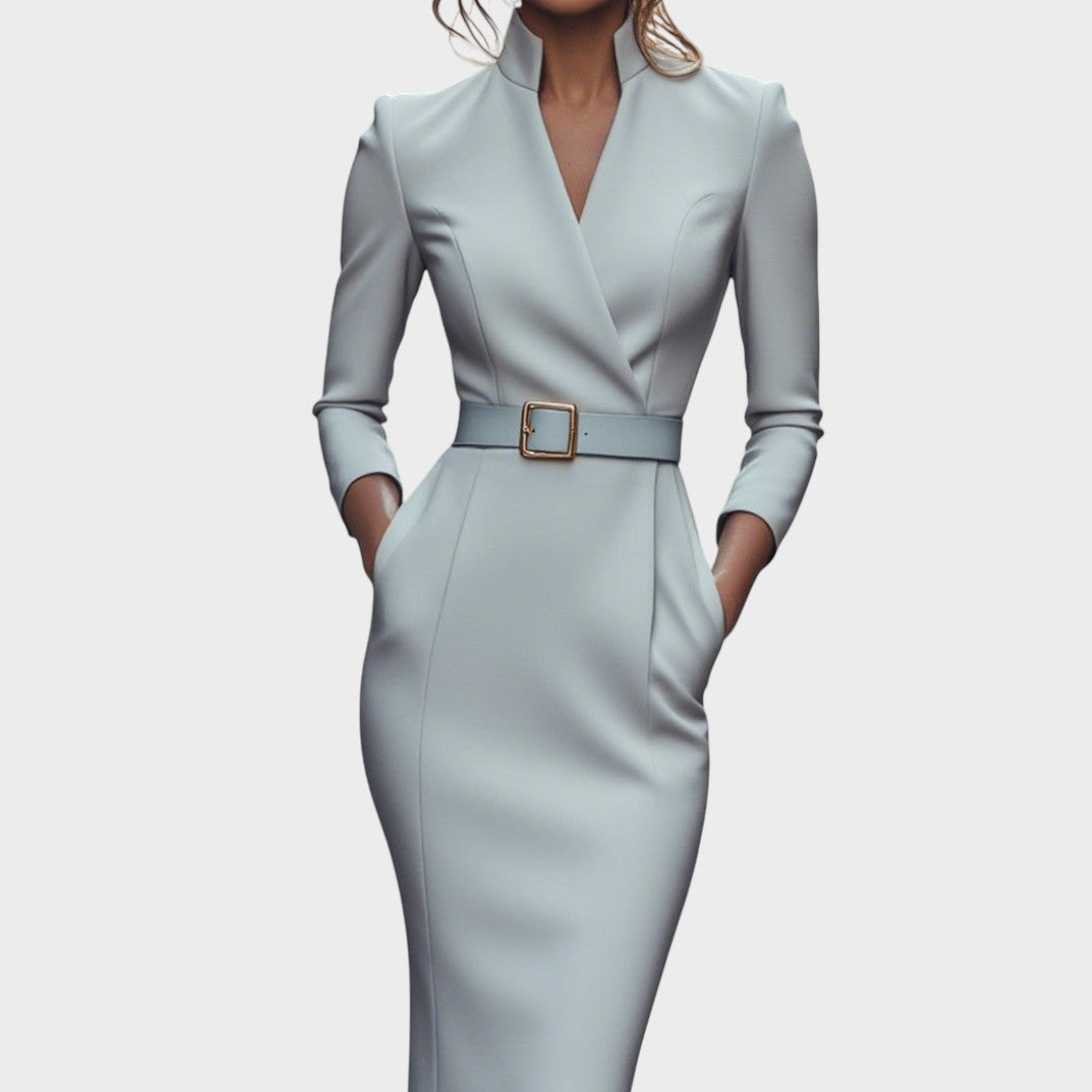 Griežtas siluetas, strateginis kirpimas ir preciziškas siuvimas – tai rezultato orientuota suknelė, kuri dirba už jus. Apgaubiantis „wrap“ tipo priekis, struktūruoti pečiai, standus stovimas kaklelis ir 3/4 rankovės formuoja švarų, autoritetingą vaizdą. Integruotas diržas su metaline sagtimi užrakina juosmenį, o paslėptos kišenės suteikia praktinį pranašumą. Midi ilgis – tinkamas tiek valdybos kambariui, tiek vakariniam scenarijui.