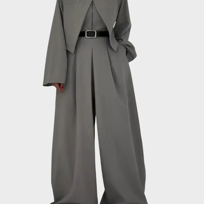 Trijų dalių komplektas su struktūriniu topu, trumpintu švarkeliu ir plačiomis, aukštu juosmeniu kelnėmis kuria skulptūrišką, „executive-ready“ siluetą. Aštrūs klostavimai, švarios linijos ir integruotas diržas formuoja proporcijas, o ilgas kritimas suteikia dinamikos. Derinys lengvai perjungiamas tarp susitikimų ir vakaro scenarijų – maksimalus funkcionalumas be kompromisų.