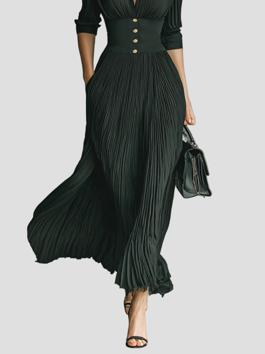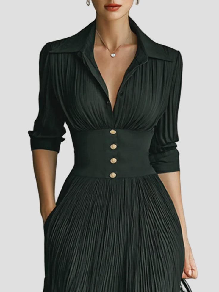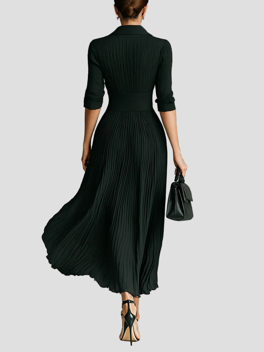 Suknelė, kuri natūraliai pabrėžia moteriškumą. Akcentuota liemuo dailiai formuoja figūrą, o švelniai krintantis, plisuotas sijonas grakščiai juda kartu su Jumis. Apykaklė su elegantišku atvartu suteikia subtilios klasikos, todėl ši suknelė lengvai prisitaiko prie bet kokios dienos – tiek darbo aplinkos, tiek vakaro susitikimų ar išskirtinių progų.