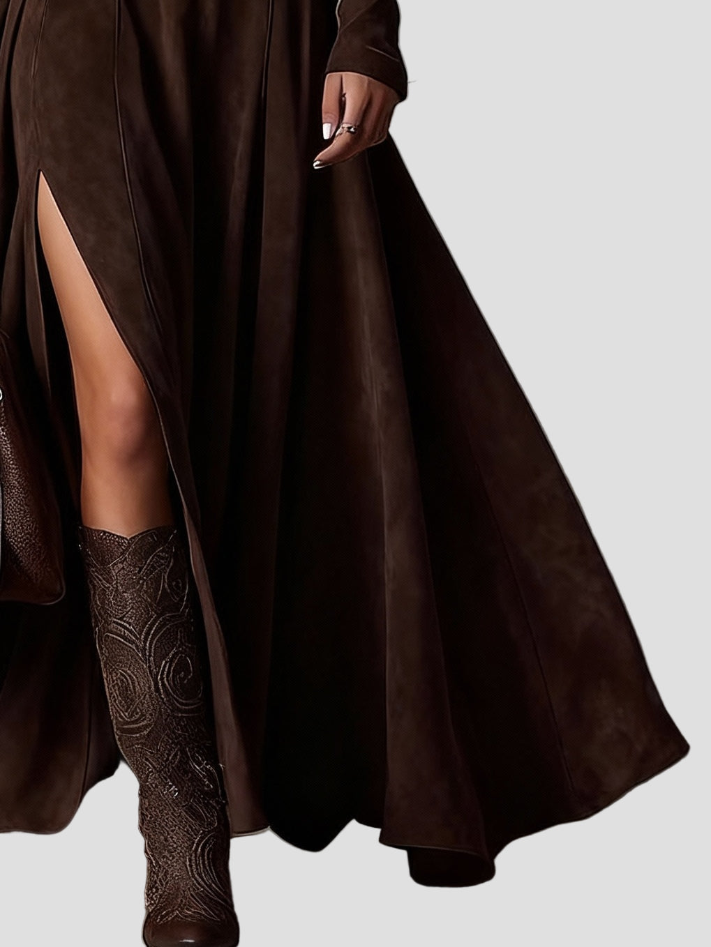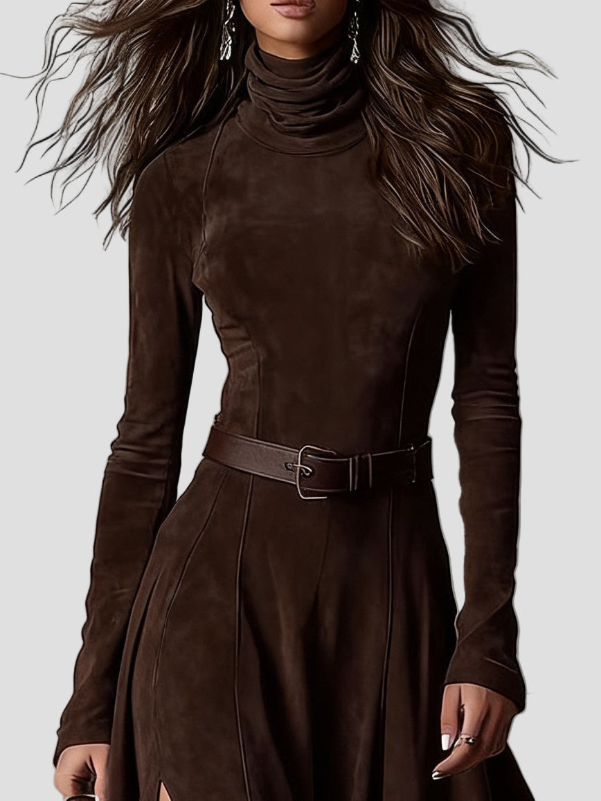 Išbandykite eleganciją ir komfortą su Domitille – maxi suknele, pasiūta iš minkšto nubuko. Jos tamsiai ruda spalva pabrėš jūsų odos atspalvį, o elegantiškas apykaklė šildys, bet nespaudžia.