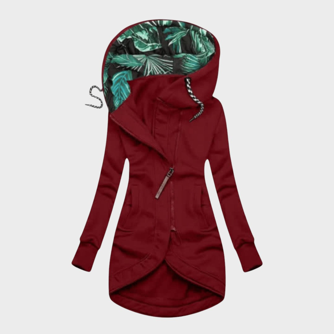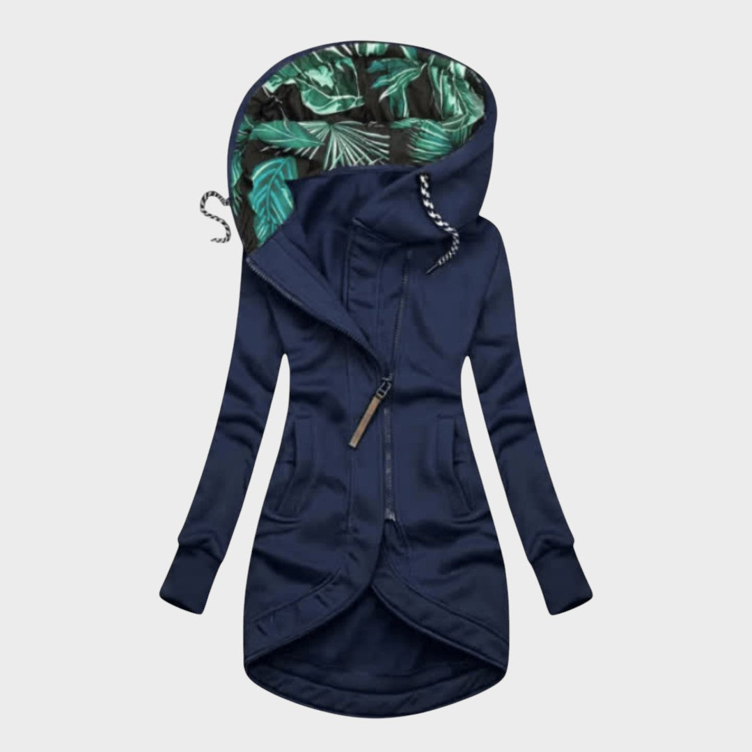 Stilingas, prailginto silueto bliuzonas su asimetrišku užtrauktuku ir įspūdingu, tropiniais raštais pamuštu gobtuvu. Minkštas, šiltas trikotažinis audinys, formą pabrėžiantis kirpimas ir aukštesnė–žemesnė apačia kuria modernų įvaizdį. Patogios įleistos kišenės ir reguliuojamos virvelės leidžia lengvai prisitaikyti prie oro ir dienos plano – nuo miesto pasivaikščiojimų iki kelionių.