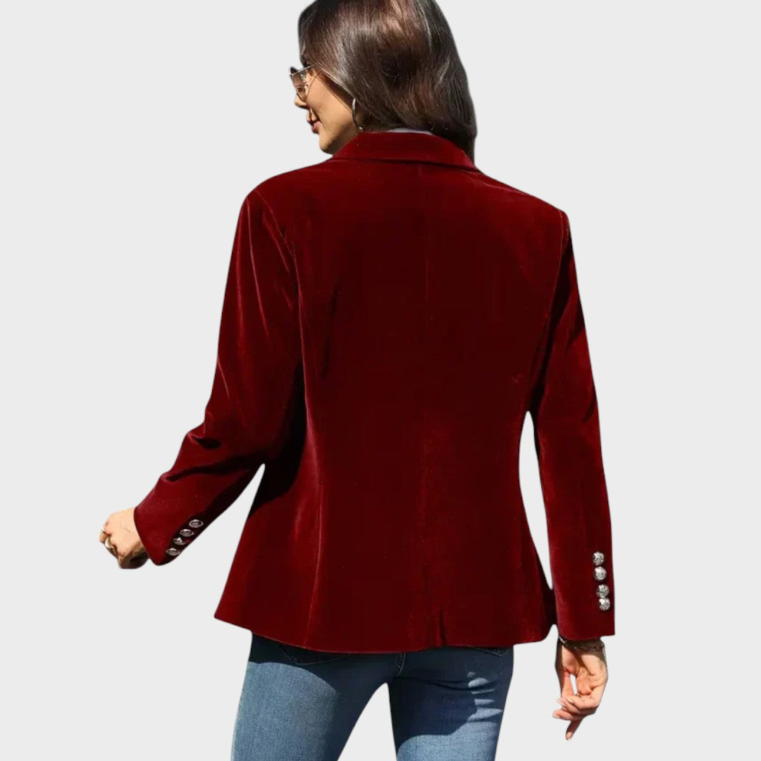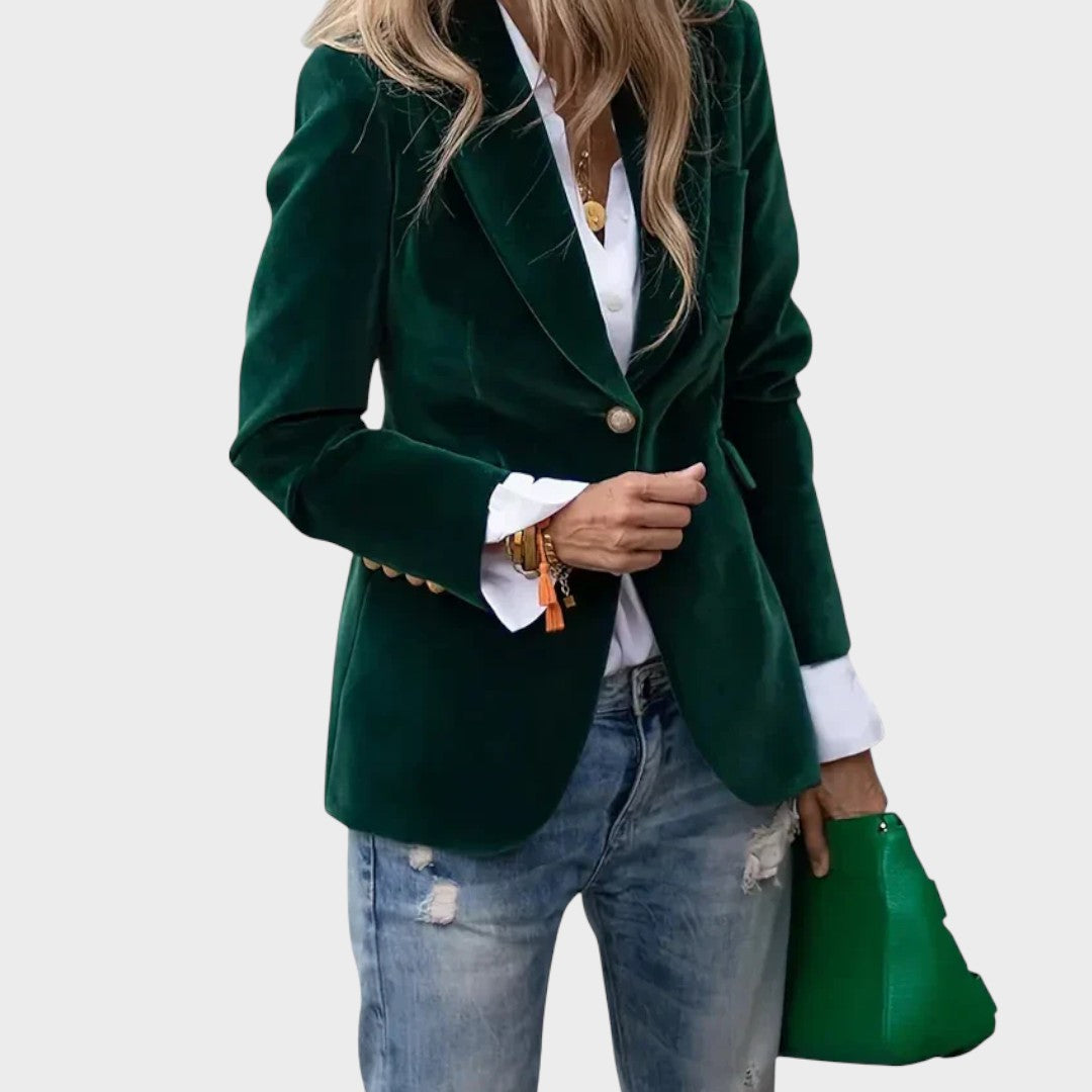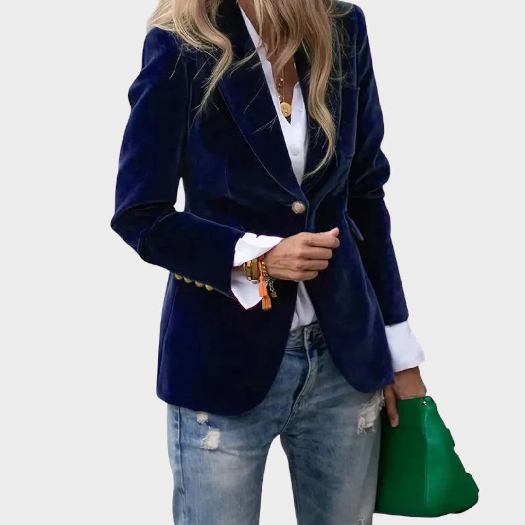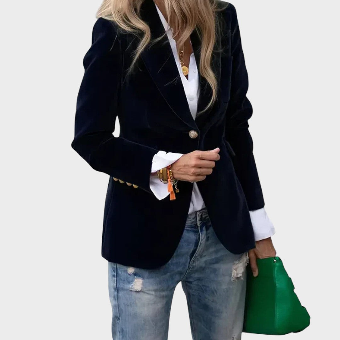 Prabangiai atrodantis, švelnaus prisilietimo aksominis švarkas su klasikiniais atvartais ir vienguba saga priekyje. Pusiau prigludęs siluetas gražiai formuoja liemenį, o dekoratyvinės sagos ant rankogalių suteikia rafinuotą akcentą. Šis modelis lengvai dera tiek su džinsais, tiek su elegantiška suknele – puikus pasirinkimas darbui, vakarui ar ypatingoms progoms.