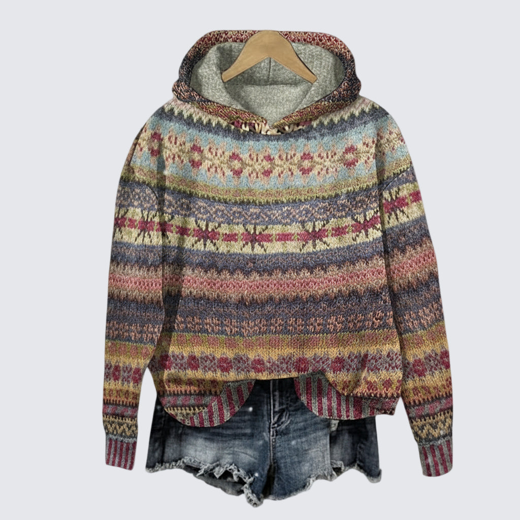 • Raštas: tradicinis „Fair Isle“ įkvėptas margas dizainas su daugybe spalvų ir geometrinių motyvų.