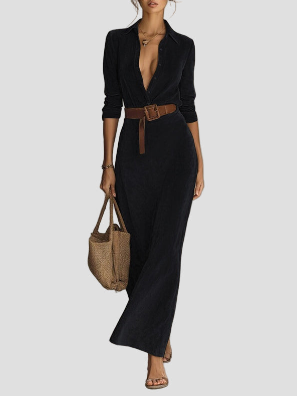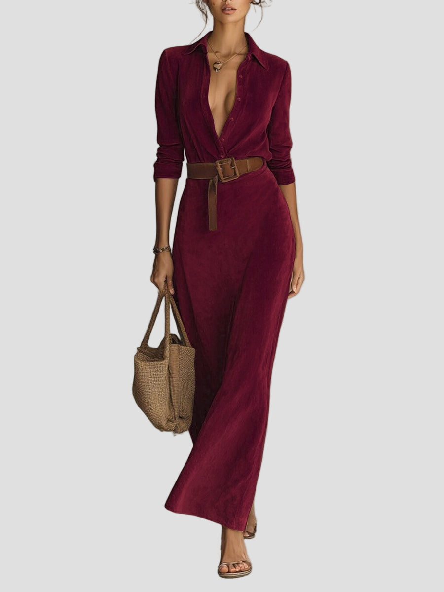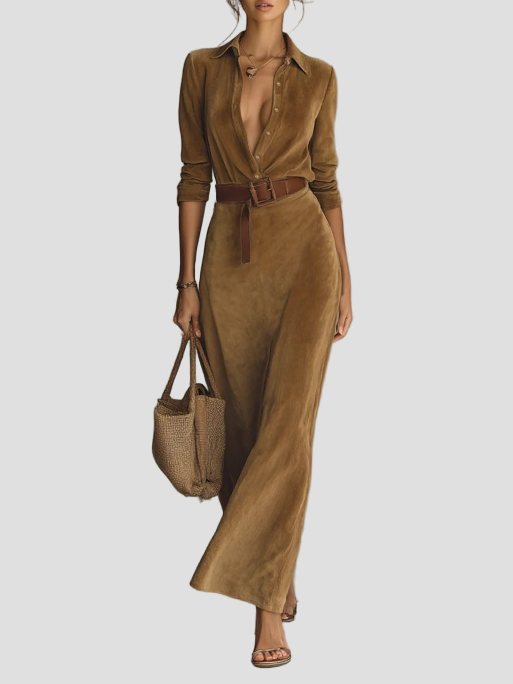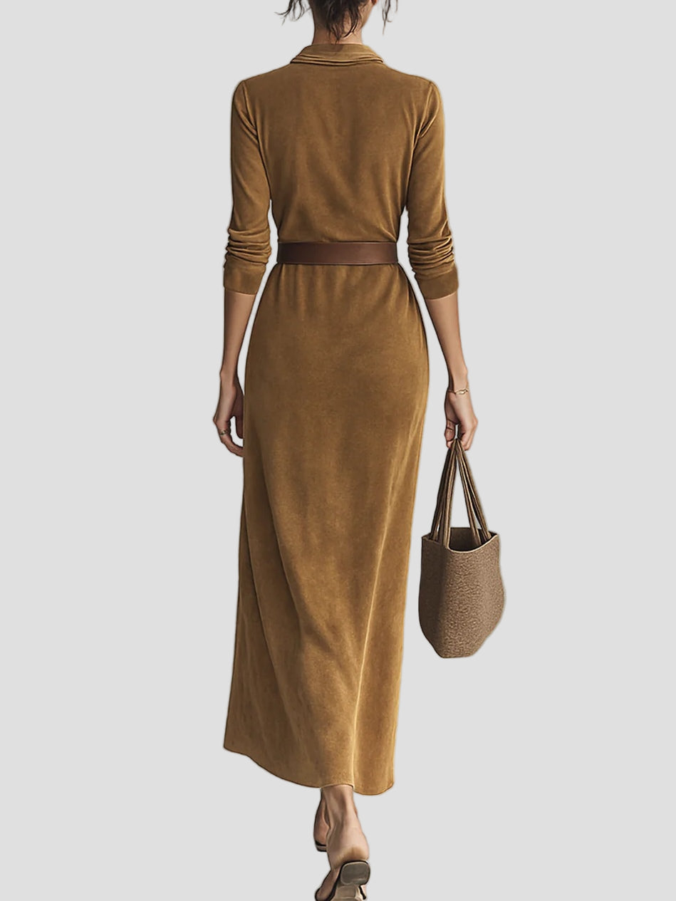 Pasinerkite į aksominę eleganciją, kuri pabrėžia figūrą. Ši suknelė iš zomšos priglunda prie kūno, bet nespaudžia, o apykaklė formuoja krūtinę. Ilgas ilgis pailgina siluetą, todėl ji puikiai tinka tiek verslo susitikimams, tiek vakarienėms.